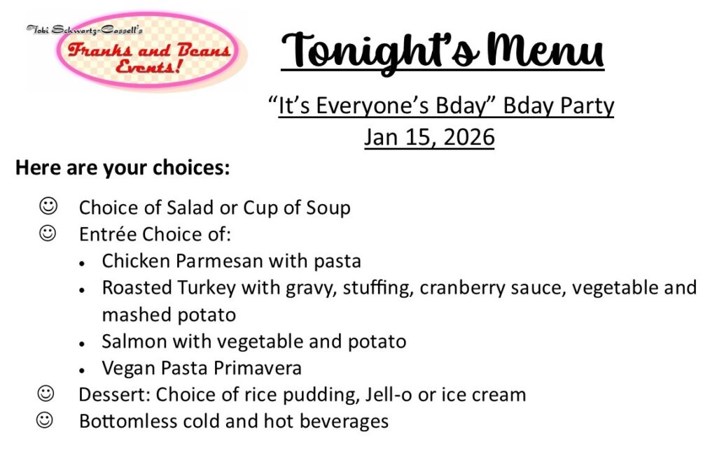 - A full BYOB dinner with choice of entrées; mostly every diet accommodated