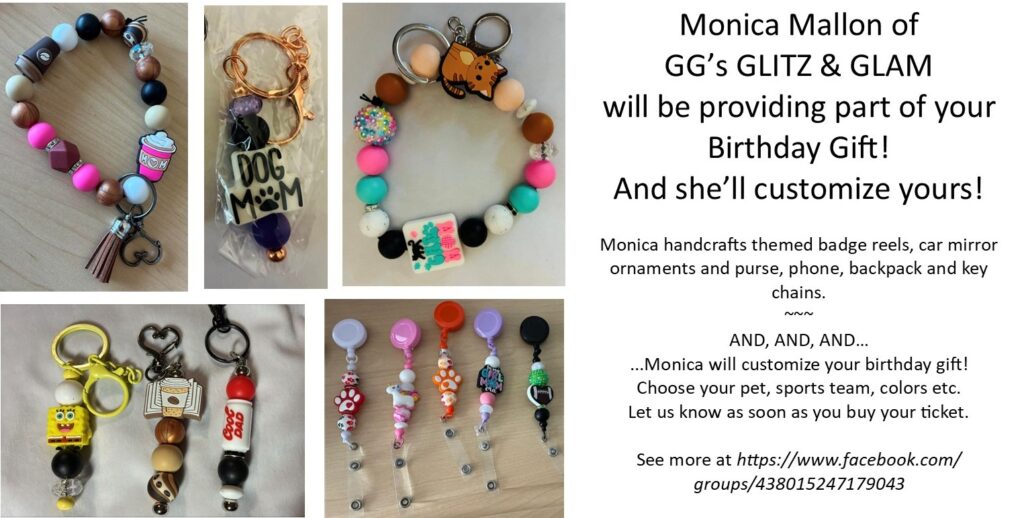 Birthday Guests: Everyone will receive a Birthday Gift from our sponsors, with a minimum retail value of $30–AND GROWING–per gift! Those pictured here are examples of past gifts. Gifts at this event might vary from one another, but all will be valued the same as each other.